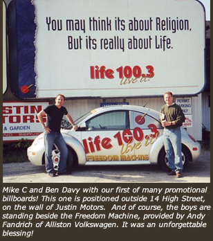 Greg has been the catalyst for a number of citywide evangelistic projects. So, it only makes sense that it would be Greg who came to me about getting billboards for LIFE 100.3 on the busiest streets. Our first billboard proclaimed the slogan - "You May Think It's About Religion, but really it's about LIFE". I wish I could take the credit for the slogan but we borrowed it from a Christian station in Houston, Texas. You see, there are no new ideas!